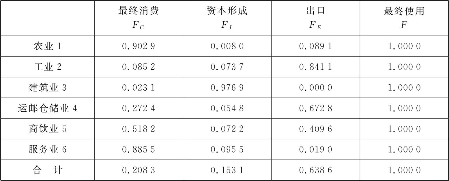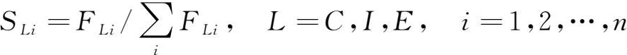 式中, S Ci , S Ii , S Ei 分别表示第 i 部门的最终消费、资本形成、输出分配结构系数; F Ci , F Ii , F Ei 分别表示第 i 部门的最终消费、资本形成、输出项目数量。最终需求的分配结构系数表示的是某部门某项最终使用产品占该部门最终使用总量的比例。