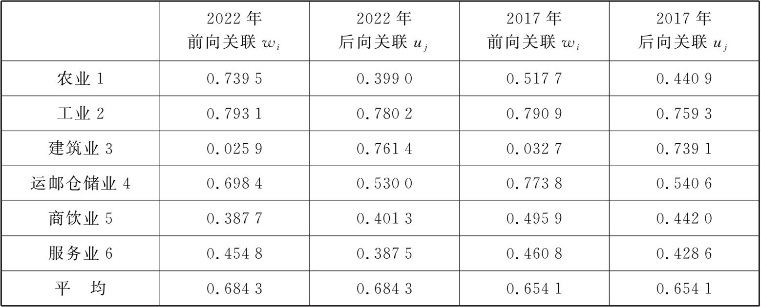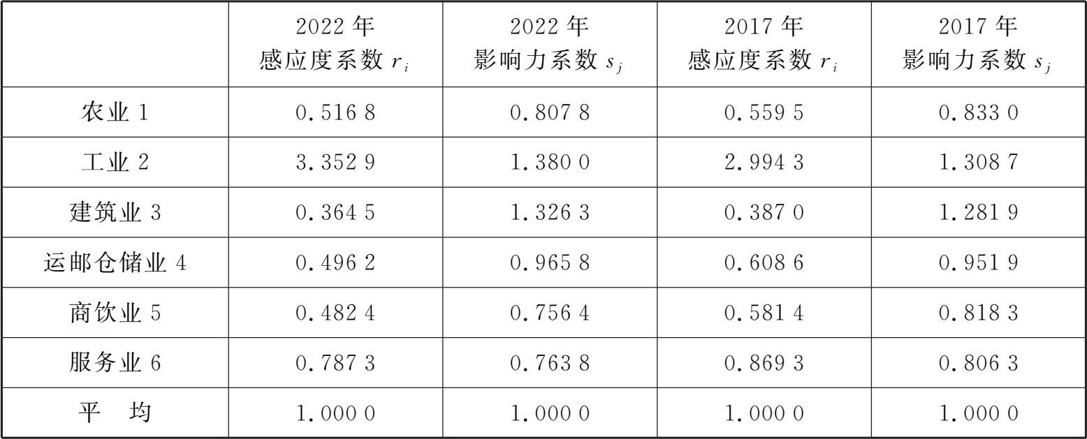 表4-22 某地区2022年和2017年感应度系数和影响力系数
