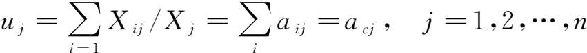 式中, u j 表示第 j 部门的中间产品需求系数,是第 j 部门后向关联效果的指标, u j 高为制造业, u j 低为初级产业; X ij 表示第 j 部门在生产中消耗的第 i 部门产品的数量; X j 表示第 j 部门产品总量; a ij 表示第 j 部门在生产中消耗的第 i 部门产品的直接消耗系数; a cj 表示第 j 部门在生产中消耗的几个部门产品的直接消耗系数。