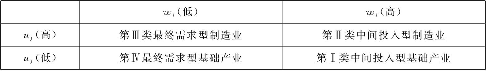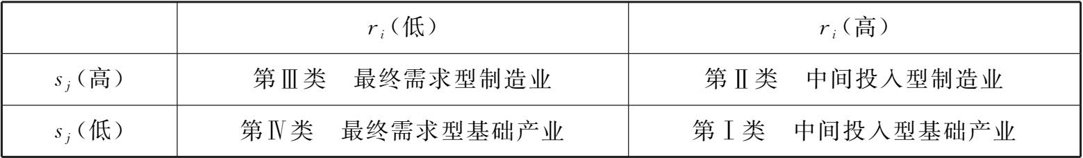 依据中间产品需求系数和中间产品投入系数可以将全部的产业分为四类,即第Ⅰ类的中间投入型基础产业,第Ⅱ类的中间投入型制造业,第Ⅲ类的最终需求型制造业和第Ⅳ类的最终需求型基础产业(见表4-20)。