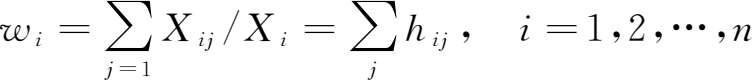 式中, w i 表示第 i 部门的中间产品需求系数,是第 i 部门前向关联效果的指标, w i 高为中间产品产业, w i 低为最终产品产业; X ij 表示第 j 部门在生产中消耗的第 i 部门产品的数量; X i 表示第 i 部门产品总量; h ij 表示第 i 部门产品分配给第 j 部门的分配系数。
