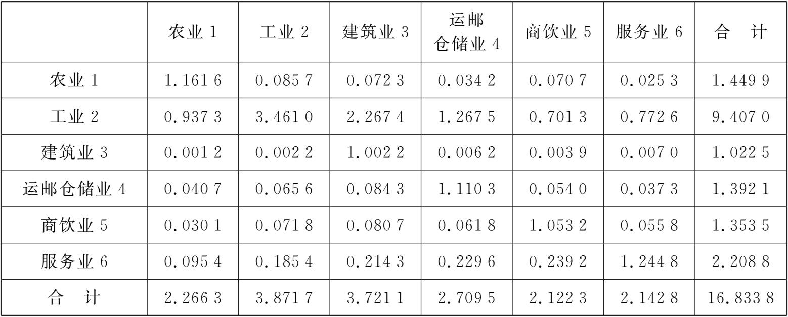 影响力系数亦称带动系数,公式中分子表示产业 j 生产单位最终产品时, n 个产业对它的完全投入之和;分母可理解为 n 个产业共同平均每生产一单位最终产品时 n 个产业的完全投入之和。产业带动系数描述了一产业生产单位最终产品所诱发的 n 个产业的完全投入是否高于社会平均生产单位最终产品所诱发的 n 个产业的完全投入量。带动系数大于1的产业对各产业生产的完全诱发程度大,因而在经济发展中有重要的带动作用。