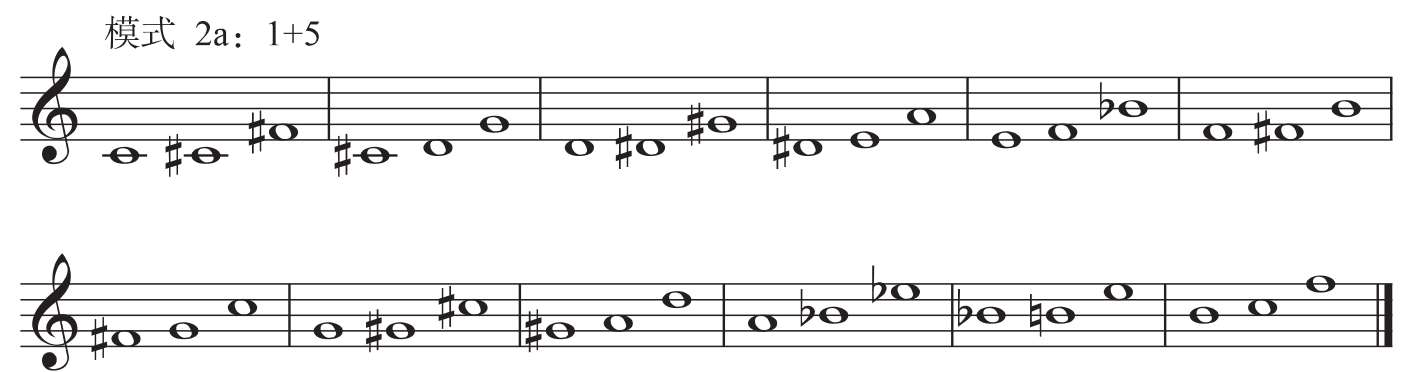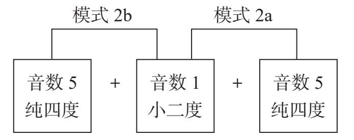 将模式1a进行第一次转位,如将谱例1-4-1第一小节三音组的三音 # F作为低音,构成 # F—G—C,便形成模式2的第一种组合形态,即音数1+音数5。可以概述为:在小二度、增一度或大七度的上方,增加一个纯四度或纯五度音,如C— # C— # F,以半音阶各音为根音依次构建,可构成12种模式,称之为“模式2a”。第二种组合与其相反,即音数5 +音数1,是在小二度、增一度或大七度的下方,增加一个纯四度或纯五度音,如G—C— # C,以半音阶各音为根音依次构建,可构成12种模式,称之为“模式2b”。两种组合形态可以理解为以小二度为中心,在其上方或下方分别增加一个纯四度音(见图1-4-2)。