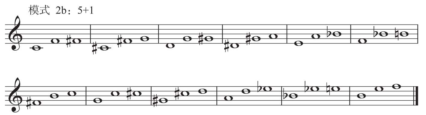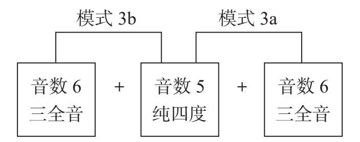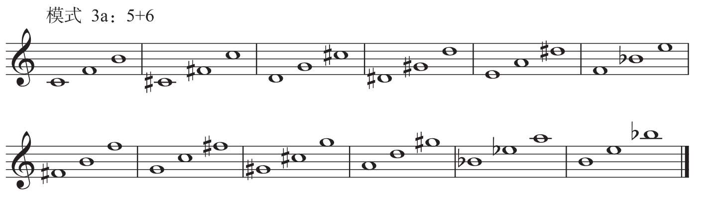将模式1a进行第二次转位,或者将模式2a进行第一次转位,便可构成模式3。如将谱例1-4-2第一小节三音组的三音 # C作为低音,构成 # C— # F—C,便形成模式2的第一种组合形态,即音数5 +音数6,以半音阶为根音依次构建,可构成12种模式,称之为“模式3a”。第二种组合与之相反,是在音数5的下方加入一个三全音,如G— # C— # F,即音数6 +音数5,以半音阶为根音依次构建,可构成12种模式,称之为“模式3b”。两种组合形态可以理解为以纯四度为中心,在其上方或下方分别增加一个三全音(见图1-4-3)。