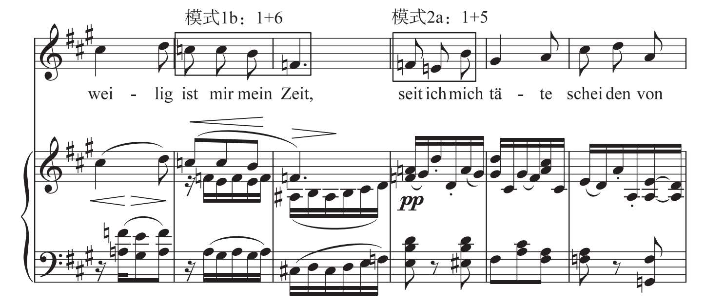 其中《歌曲六首》(Op.8)由管弦乐伴奏,这在其整个歌曲创作中并不多见,无调性三音组的使用也比较频繁。第一首中主要使用的有模式1a,如第19~20小节旋律声部的 b G—C—B等,以及模式2b,如第50~52小节旋律声部的F—C—B。第二首中使用的有模式1b,如第7小节旋律声部的D— # C— # G等,以及模式2b,如第38~39小节旋律声部的A—D— # C。第三首是六首歌曲中使用最多的,使用模式1b的有第10~11小节旋律声部的C—B—F(见谱例1-4-4),使用模式1a的有C— b G—F;使用模式2a的有第12(谱例1-4-4)和35小节旋律声部的F—E—B、第19~20小节旋律声部的 # G—A—D等。第四首中使用的有模式2b,如第2小节旋律声部的F—C—B;模式2a,如第26小节旋律声部的F—E—B;模式1b,如第62~63小节旋律声部的C—B—F等。第五首使用的有模式3a,如第20~21小节旋律声部使用的B—E—F和F—C— # F;模式1b,如第53小节旋律声部的C—B—F等。第六首使用的有模式2a,如第5~6小节旋律声部的 # F—G—C;模式3a,如第10小节旋律声部的 # F—B— # E等。