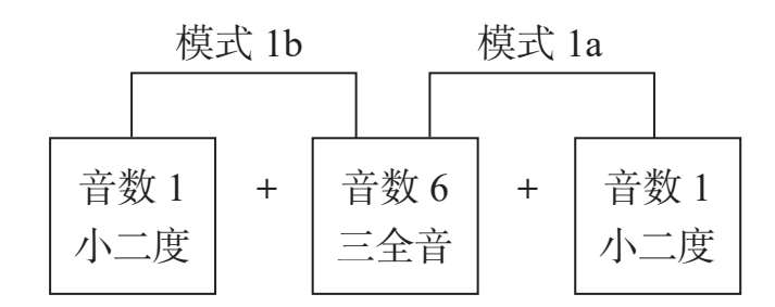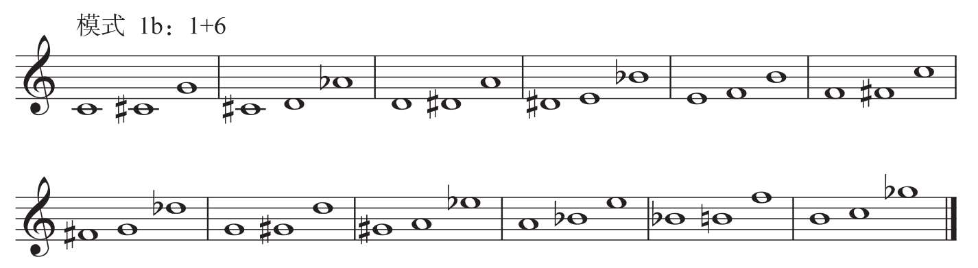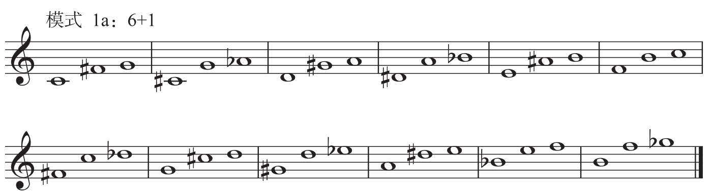 模式1有两种组合形态。第一种组合是音数6 +音数1,即三音组的下方为三全音,另外一个音是在三全音的上方叠置一个小二度、大七度或增一度关系的音,如C— # F—G,以半音阶各音为根音依次构建,可构成12种模式,称之为“模式1a”。第二种组合与其相反,即音数1 +音数6,是在三全音的下方增加一个小二度、大七度或增一度音,如B—C— # F,以半音阶各音为根音依次构建,可构成12种模式,称之为“模式1b”。两种组合形态可以理解为以三全音为中心,在其上方或下方分别增加一个小二度、大七度或增一度音(见图1-4-1)。