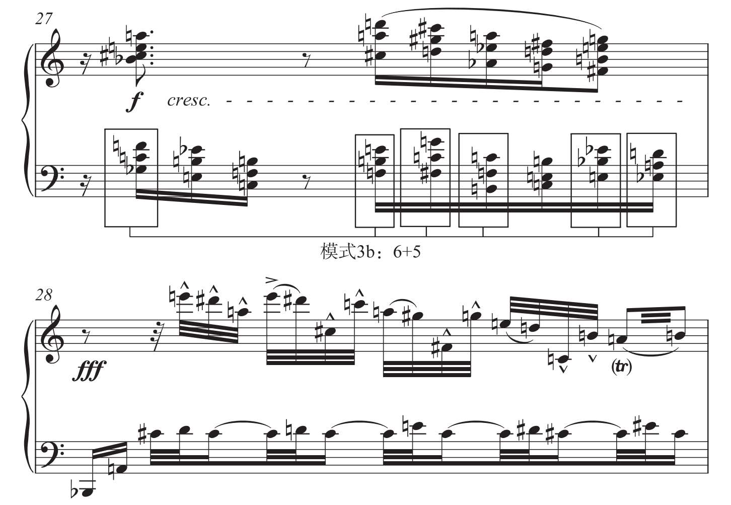 谱例1-4-5:《钢琴曲三首》(Op.11)第3首第27~28小节