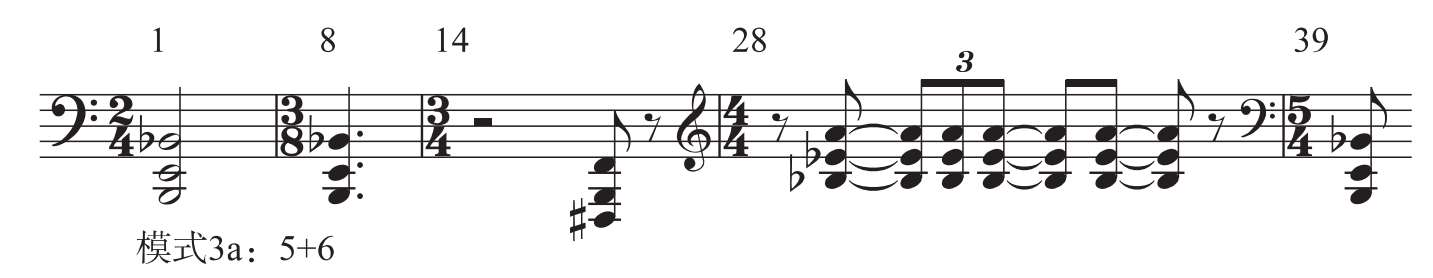 无调性三音组同样贯穿于全曲之中,首先在旋律声部广泛运用模式1b,如开始处的C—B—F,随后第3小节旋律声部出现D— # C— b A,下方的琶音声部则为 b A—G— b D和 b B—A—E等,这种横向上的音数1+音数6形态,对调性的破坏力极强,使得乐曲刚刚开始就处于无调状态。模式1b在随后的音乐发展中继续被反复使用,如第一段第8小节的C—B—F、第26~27的小节 b B—A— b E;第二段第31小节的D— b E—A、33小节的A— b B—E和第39~40小节的 b A—G— b D、C—B—F等;第三段第42~43小节的C— b D—G、44~45小节的 # D—E— b B和52小节的F— # F—C、 # F— # E—B等;第55小节则改变成模式2a,音高级为G— b A— b D,第64~66小节再次转回到模式1b,音高级为 b B—A— b E。