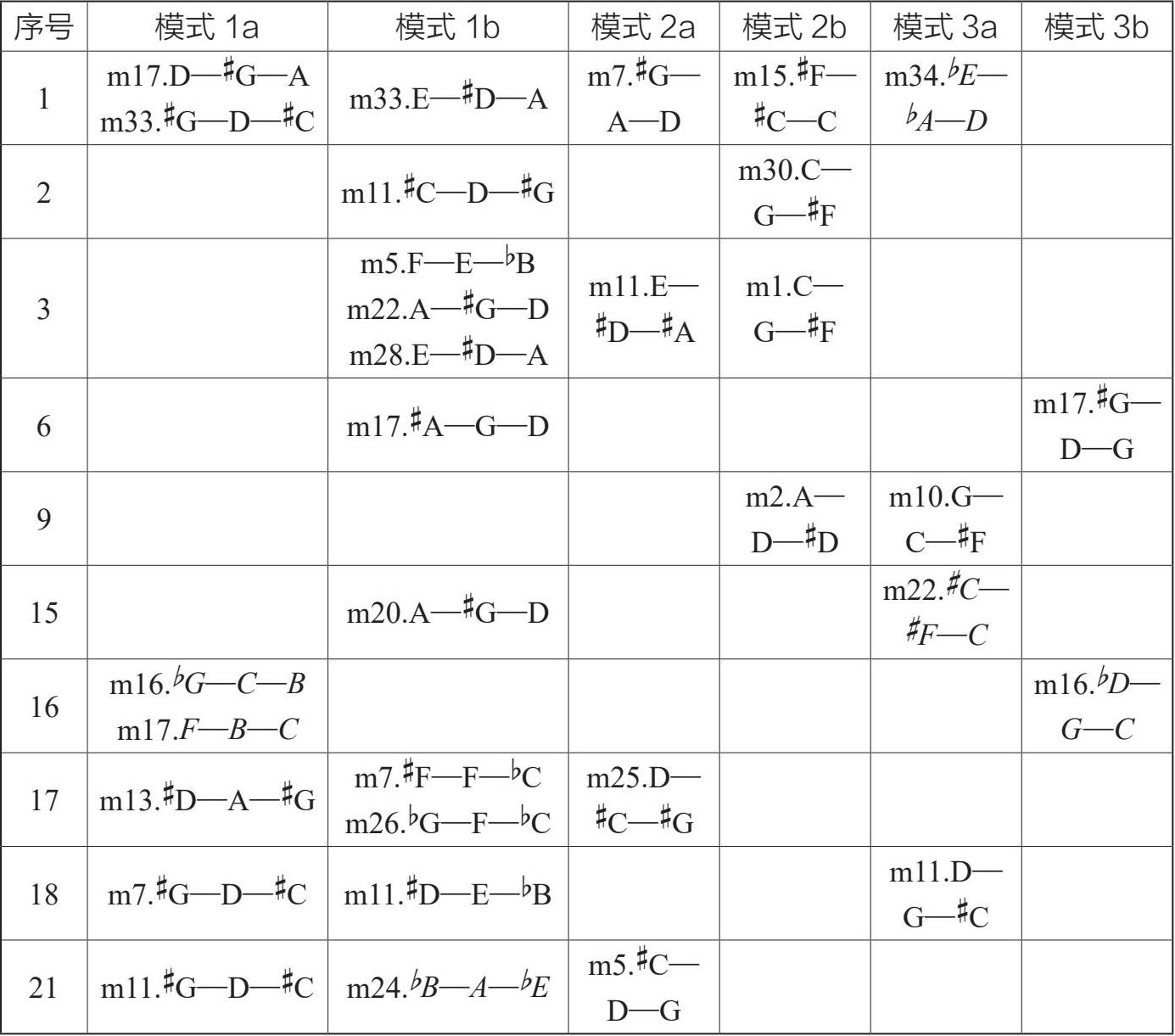 从表1-4-1中可以看出,《月迷彼埃罗》中均使用了横向和纵向上的无调性三音组。其中,模式1a和1b使用最为频繁,其次是模式2a和2b,最后是模式3a,这反映出勋伯格在这首作品的三音组使用上,仍然优先选择三全音作为无调性三音组的核心音程。