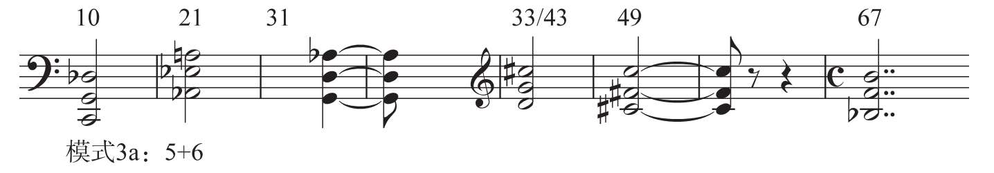 以纵向结构形态呈示的无调性三音组相对于旋律声部,来得稍迟一些,直到第10小节的低音声部才以C—G— b D呈现,构成模式3a;第11小节为E— b A— b E,构成模式3b;随后则采用了大量的模式3a,如第21小节 b A— b E—A、第31小节G—D— b A、第33小节D—G— # C、第43小节D—G— # C、第44小节 b E— b A—D、第45小节G—C— # F和第49小节 # C— # F—C等;第66小节 b A—E—A为模式3b,第67小节 b B—F—B转回到模式3a(见谱例1-4-6)。