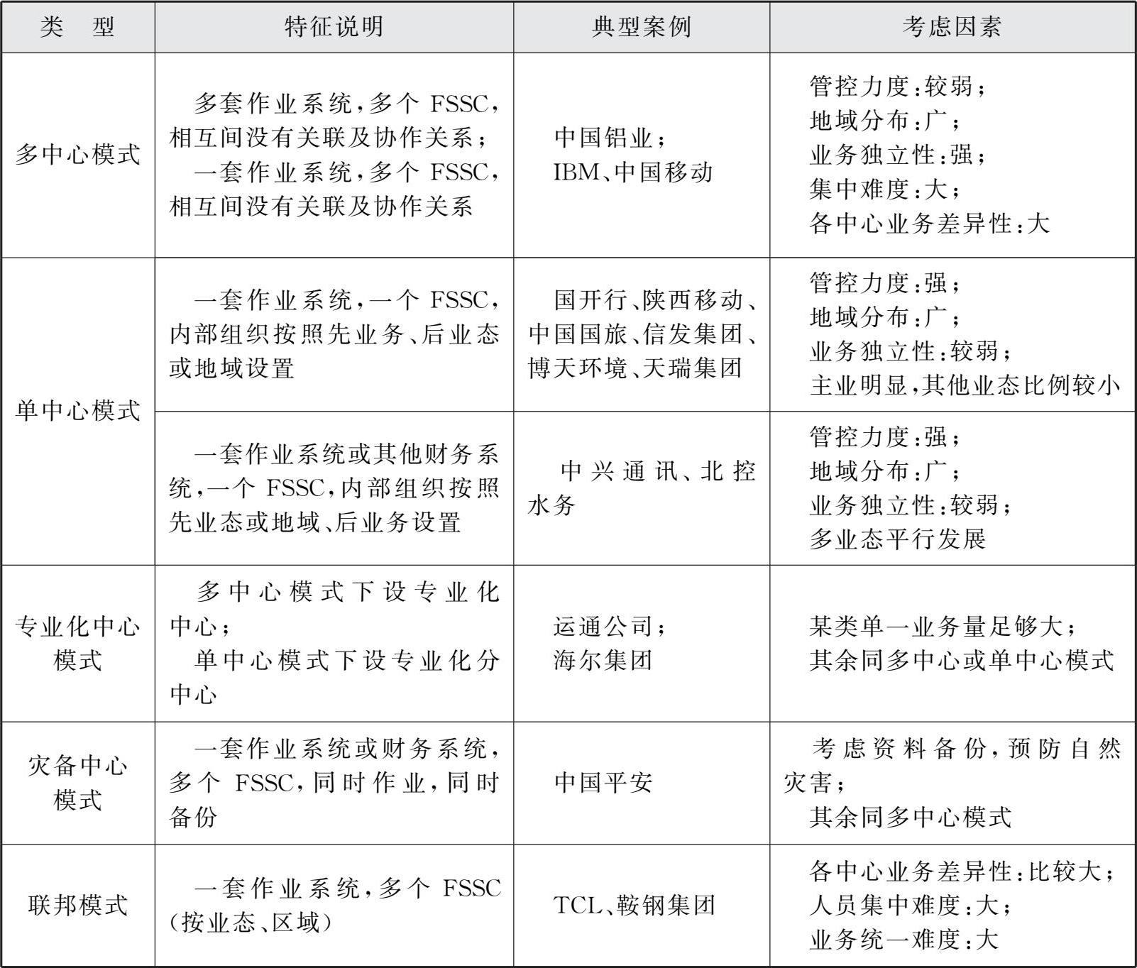 财务共享服务中心建设是一次财务变革,难度大、风险高;不同企业根据不同的管理基础、业务重点、行业特点以及风险偏好来选择不同模式的财务共享服务中心。财务共享服务中心的模式类型如表1-1所示。