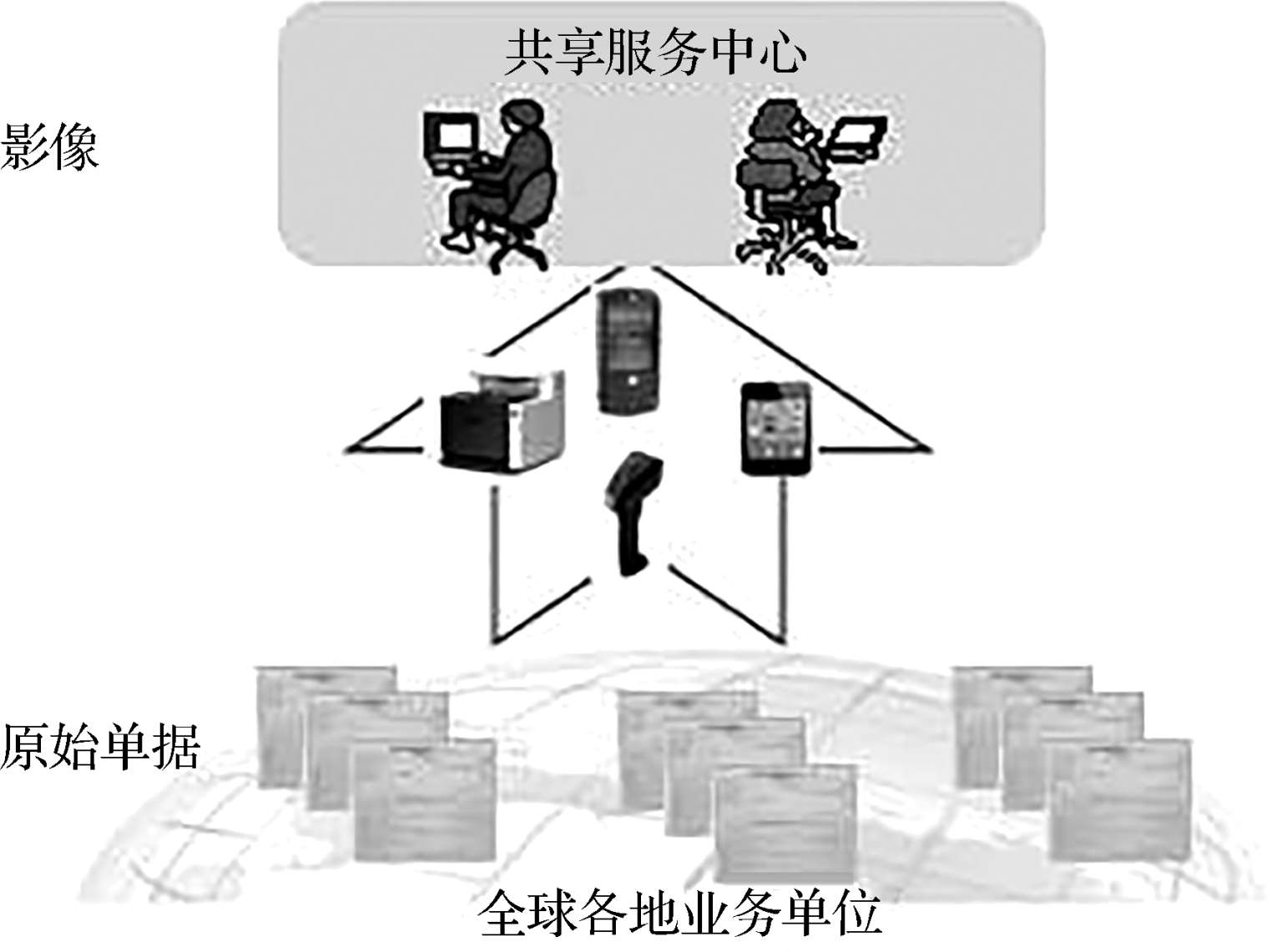 影像管理系统进行扫描设备的管理,统一分辨率设置及扫描规范;进行影像缓存及分时上传管理。影像管理平台在财务共享服务中的地位如图1-21所示。