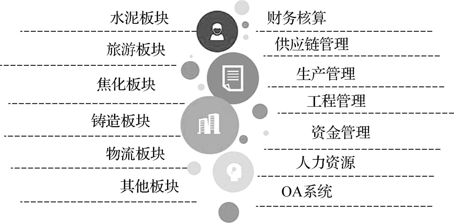 鸿途集团重视信息化建设,2013年开始全面实施信息化,先后投入使用了多个业务系统。集团、各级子公司进行了不同程度的信息化建设,所涉应用系统如下(见图1-29):