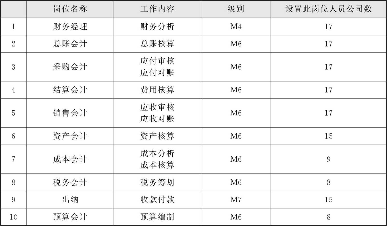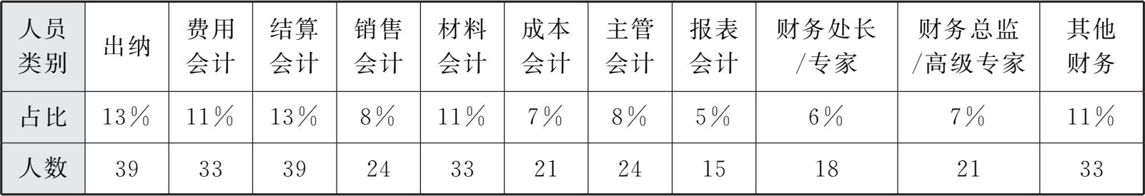从上表可以看出,财务管理岗位(财务部长、处长、总监)约占13%,大量财务人员从事销售对账、发票业务、采购入账、结算审核等基础性工作。
