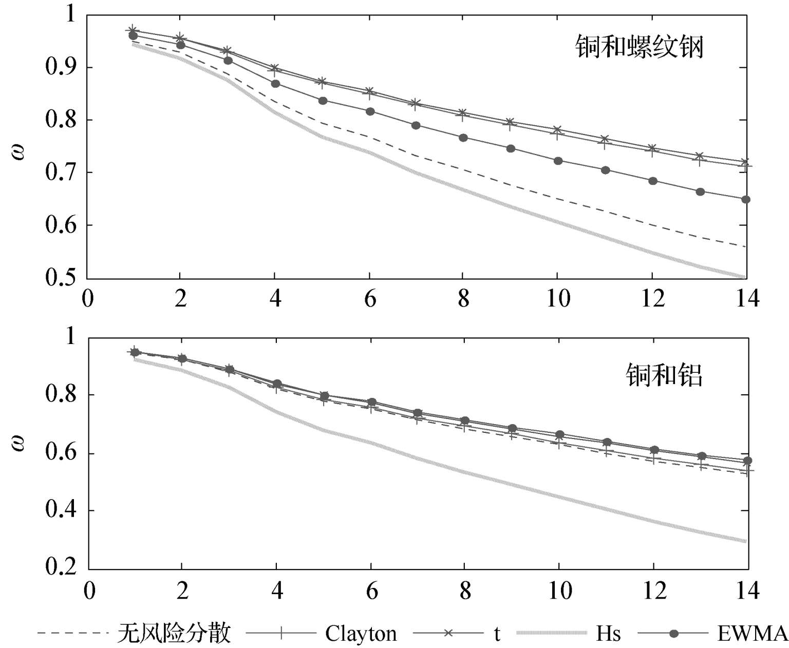 图2-5 铜和螺纹钢以及铜和铝两组质物组合分散风险效果