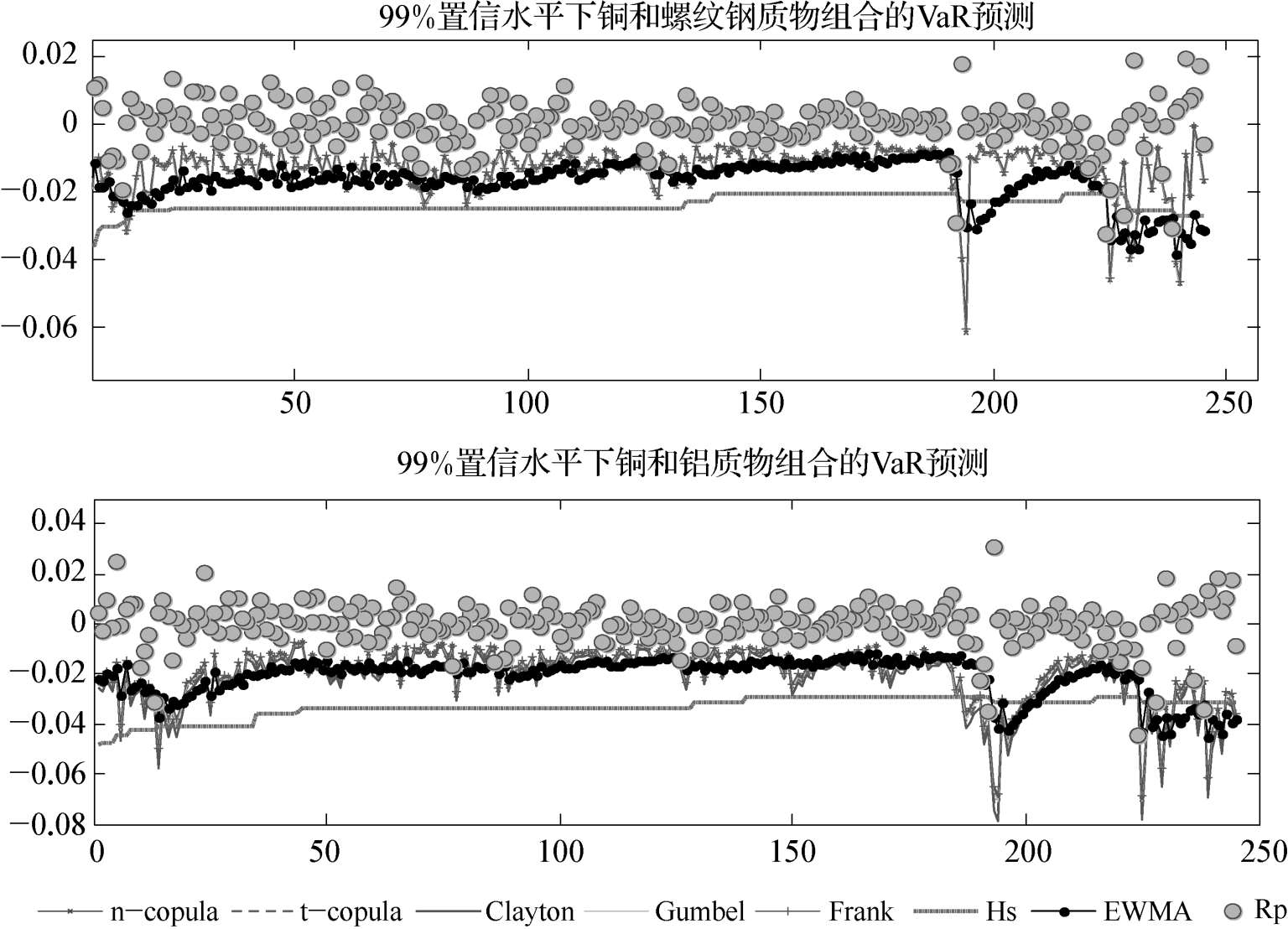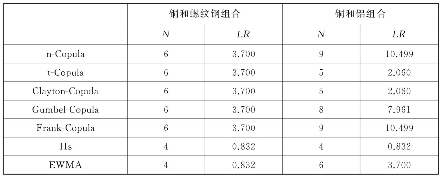 图2-4和表2-6清晰地证实,99%的置信水平下,五类Copula函数在预测铜和螺纹钢这一弱相关质物组合的VaR上并无显著区别,预测值几乎重合,回测检验中例外次数均为6次,检验统计量 LR 小于3.841,说明模型有效;而在估计铜和铝这一相关性较强的组合风险时,能够捕捉上下对称尾部相关结构变化的t-Copula和能够捕捉下尾变化的Clayton-Copula,例外次数均为5次, LR 值小于3.841,合理地估计了风险,但无法捕捉尾部结构变化的n-Copula,Frank-Copula以及仅能捕捉上尾部结构变化的Gumbel-Copula无法通过检验,低估了风险。与此相比,实践中广泛使用的历史模拟法和EWMA虽不能详尽刻画质物资产收益率间相关结构的变化,但均能估计风险。上述结果表明,对于持有质物多头头寸的商业银行而言,五类Copula函数中能够捕捉尾部损失的t-Copula和Clayton-Copula具有更高的精度。但与此同时也客观地说明Copula-GARCH族模型在详尽展现质物间相关结构的同时,风险预测的整个过程中也面临一定程度的模型风险,一方面以现货方式交易的质物,其收益率在GARCH族模型拟合过程中往往需要近似估计,这容易造成误差,而随之Copula函数的拟合及对标准残差项的蒙特卡洛模拟将进一步放大上述误差,致使模型精度并未达到非常理想的水平。Weiβ的研究亦表明上述问题的存在。
