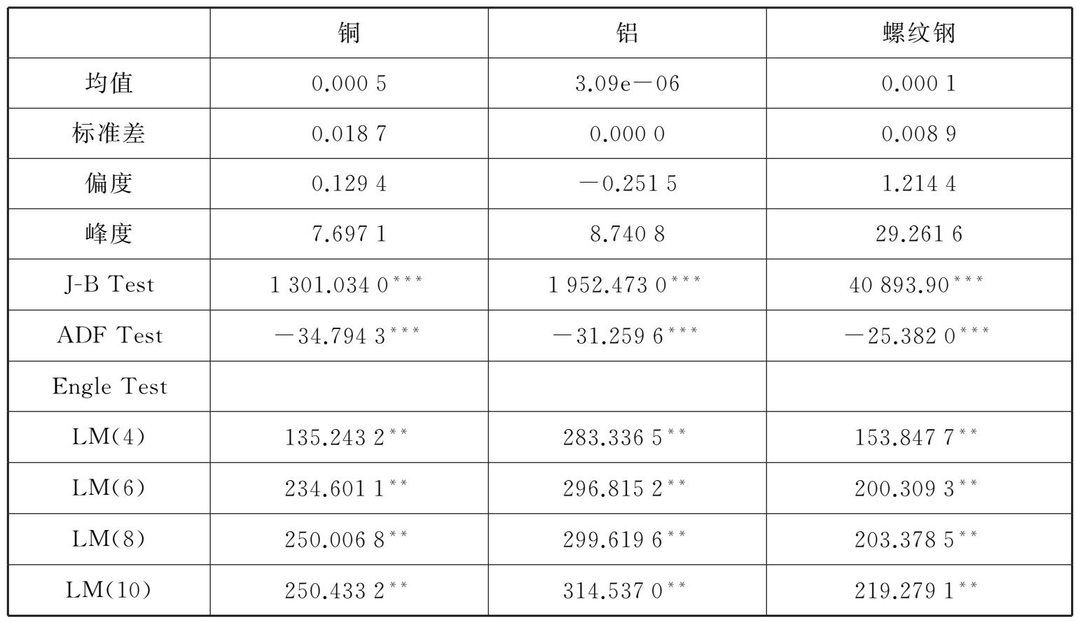表2-2 铜、铝以及螺纹钢的对数收益率描述性统计及ARCH效应检验