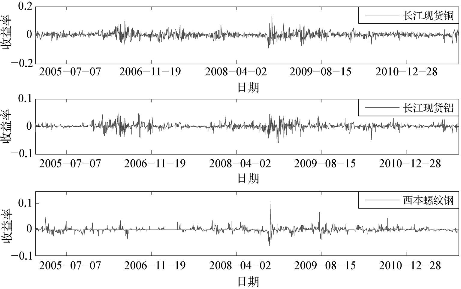图2-1 铜、铝以及螺纹钢的对数收益率序列图
