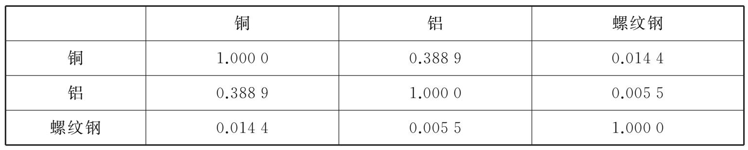 表2-1 铜、铝和螺纹钢三种质物对数收益率的Kendall秩相关系数τ矩阵
