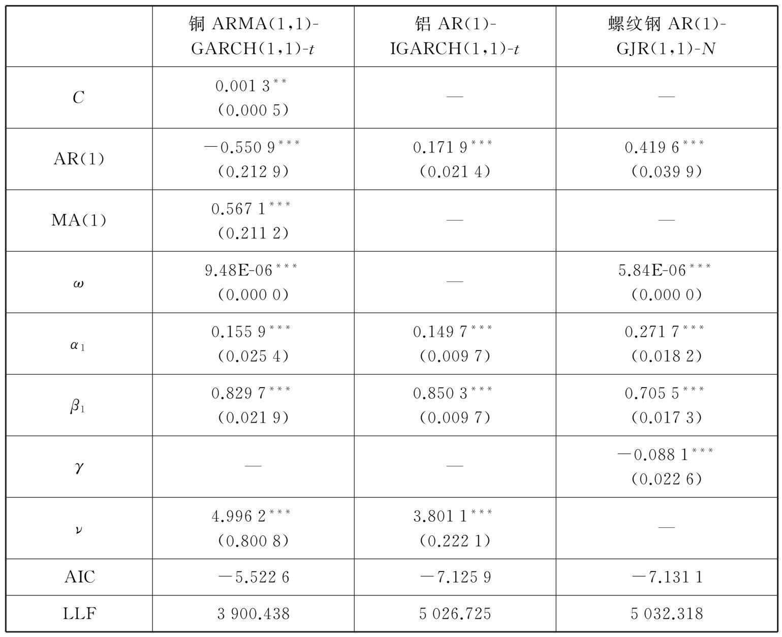 ,满足模型参数的非负条件及平稳性条件,其他各项参数均较为显著。对于铝,一般的GARCH族模型不能满足平稳性条件,因此运用特殊的AR(1)-IGARCH(1,1)-