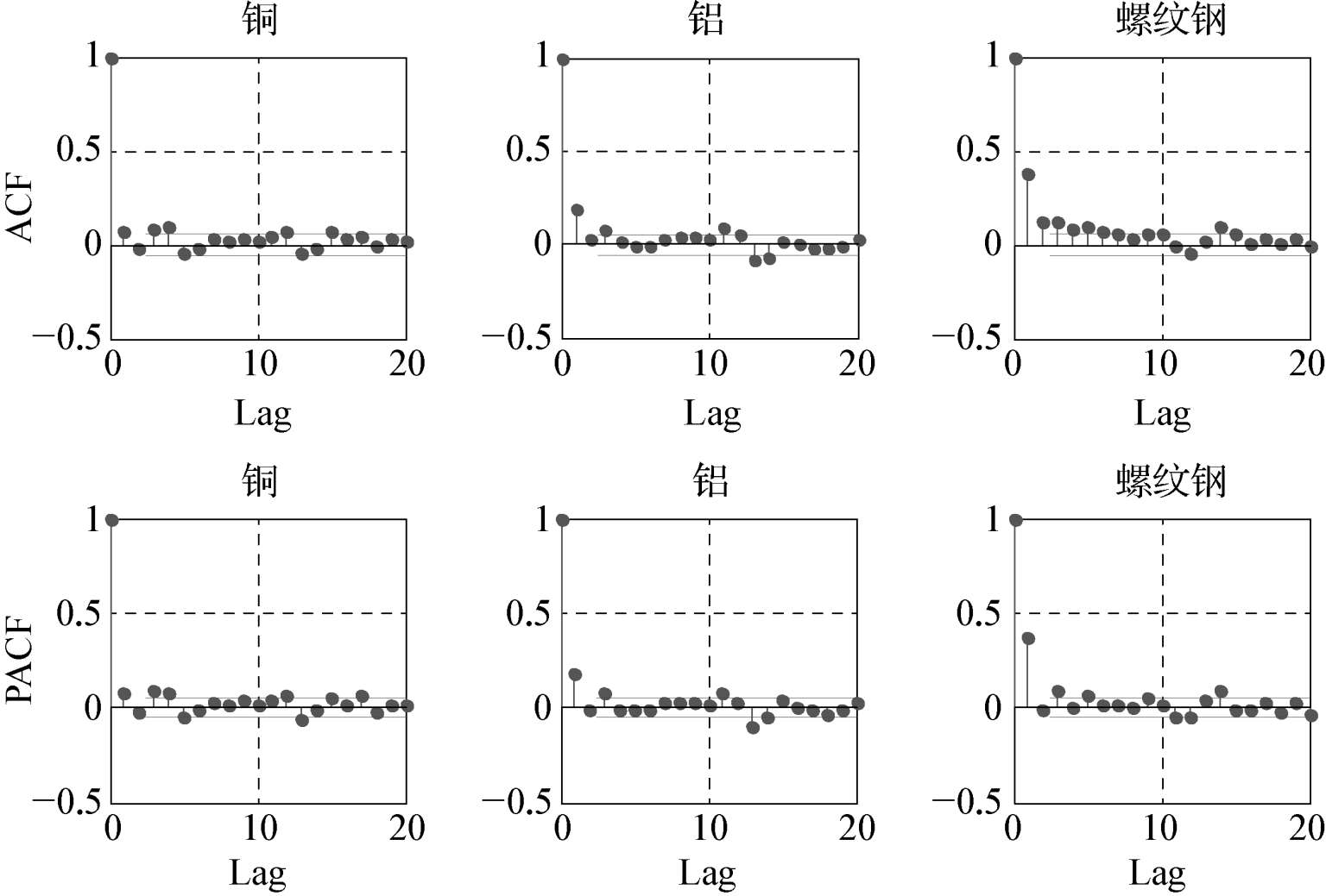 图2-2 铜、铝以及螺纹钢收益率的自相关和偏自相关图