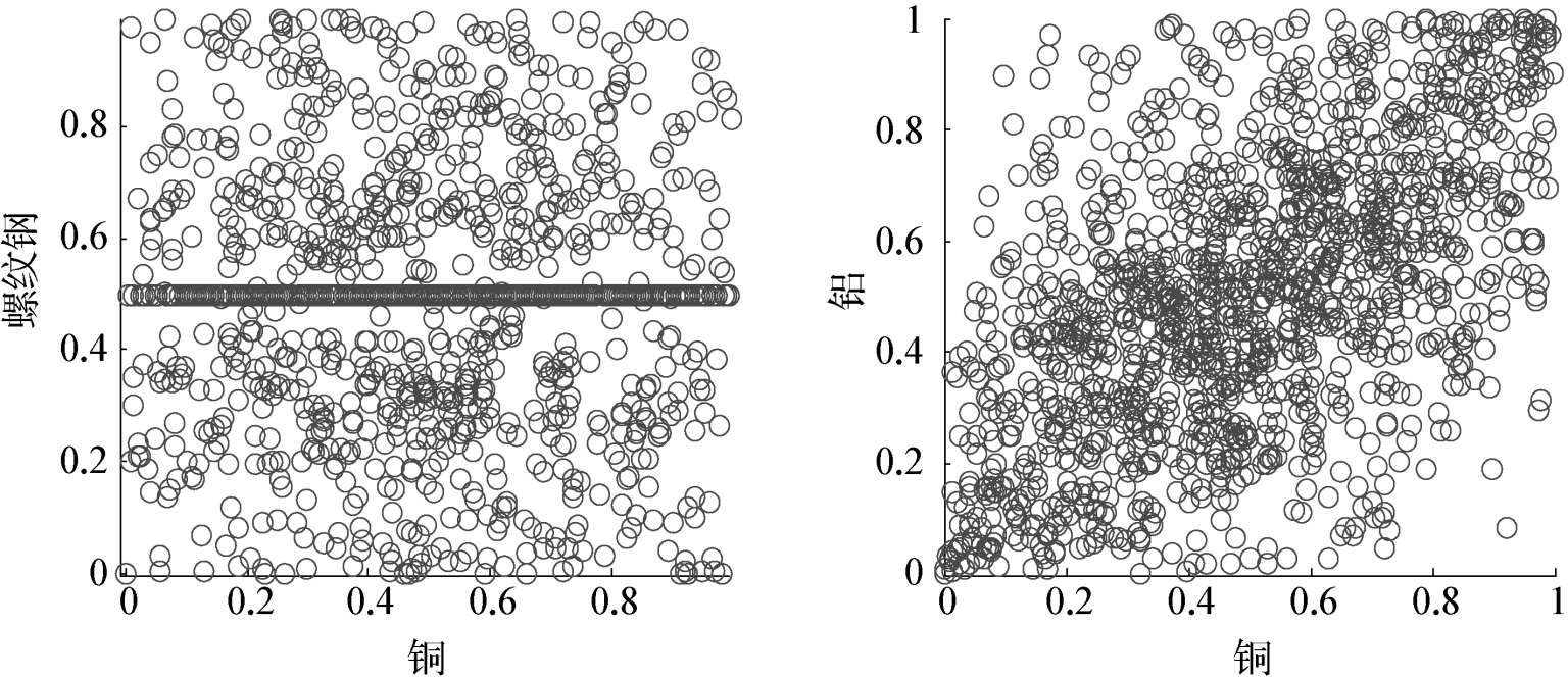 图2-3 铜和螺纹钢以及铜和铝的收益率的标准残差项经概率积分变换后的散点图