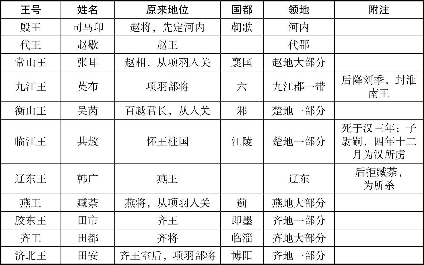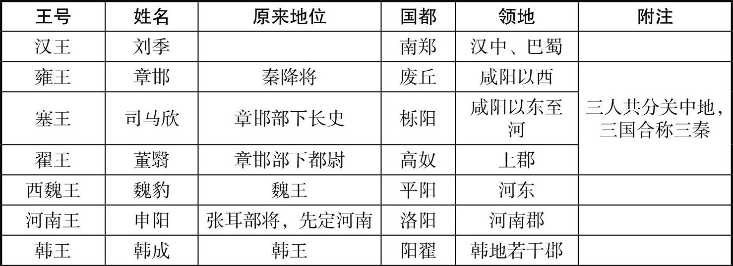随后项羽入咸阳,屠城,杀子婴,烧秦宫室,收财宝妇女,然后发号施令,分割天下。他尊怀王为义帝,却只给他湘江上游弹丸之地,都于郴(今县)。自立为西楚霸王,占旧楚、魏地九郡,都于彭城;此外他封立了十八个王国,列表如下: