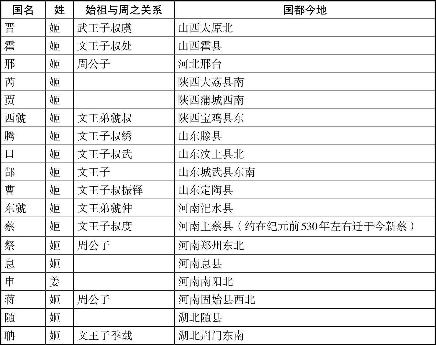 武王、成王两世,共封立了七十多个新国,其中与周同姓的有五十多国;但这七十余国而外,在当时黄河下游和大江以南,旧有国族之归附新朝或为新朝威力所不届的,大大小小,还不知凡几。在这区域内,周朝新建的和旧有的国,现在可考的有一百三十多。兹于现在可考的周初新建国中,除上面已提到的宋、卫、鲁、齐、燕外,择其可以表示周人势力的分布的十八国列表如下: