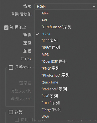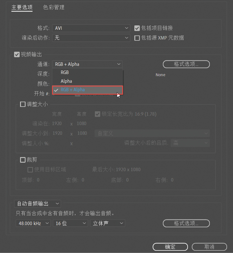 通道: 用来控制输出视频的通道。选择RGB,则输出正常色彩的视频;选择Alpha,则根据视频中的通道信息输出一个黑白视频;选择RGB+Alpha,则将正常的视频颜色和Alpha信息同时输出,但这里要注意,很多视频格式并不支持输出Alpha通道,即在输出之后Alpha信息会自动消失。