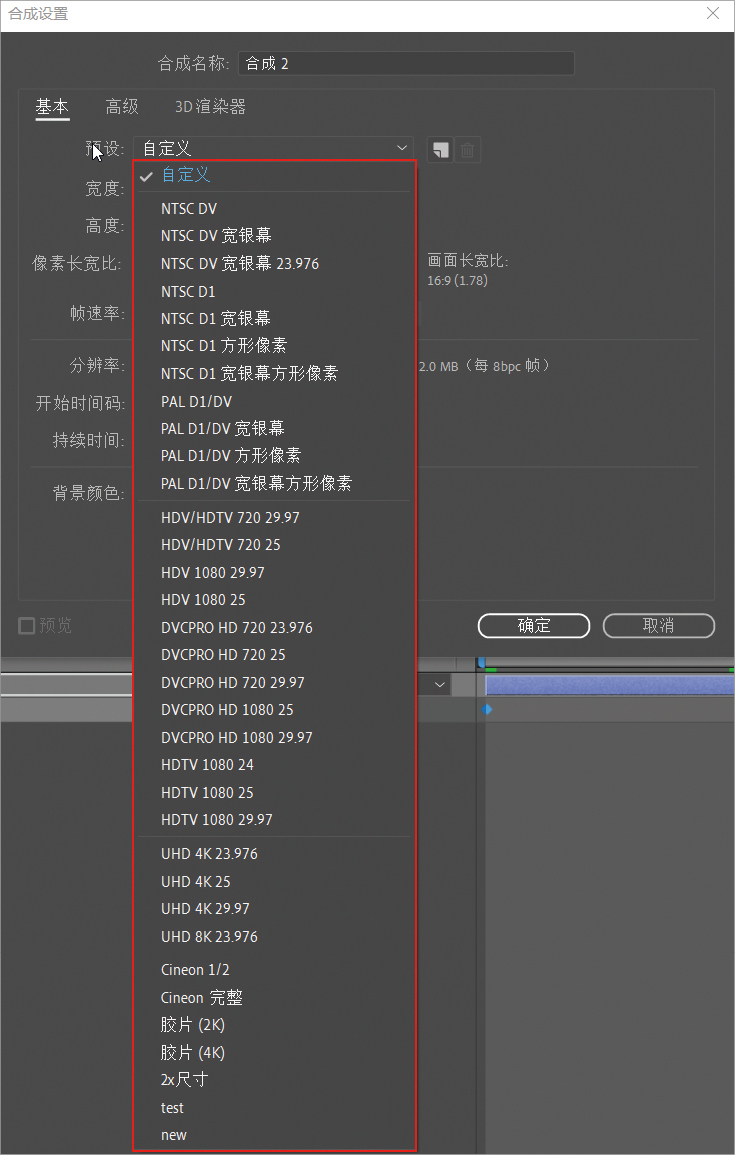 在After Effects中创建新合成时,可以在“合成设置”对话框中自定义帧速率。此外,还可以修改“预设”,帧速率会自动随预设类型改变,如图A-2所示。