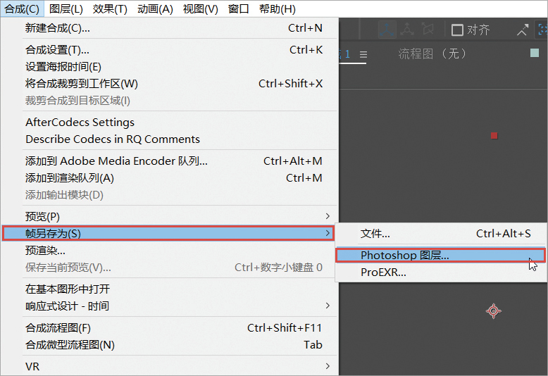 要输出视频的特定画面,需要使用After Effects自带的“渲染单帧”功能。在菜单栏中执行“合成>帧另存为>Photoshop图层”菜单命令,如图A-19所示。接下来在弹出的对话框中选择要保存的文件,以保存当前时间的画面并进行单帧渲染。