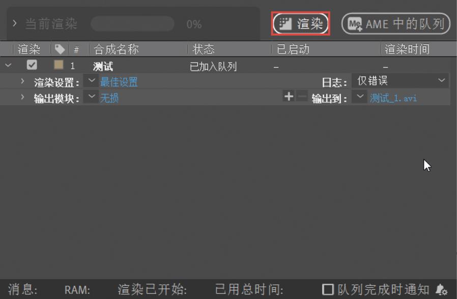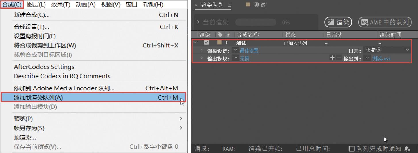 制作完视频后就可以进行渲染。在菜单栏中执行“合成>添加到渲染队列”菜单命令或按快捷键Ctrl+M,就可以将当前合成添加到After Effects的渲染队列,如图A-4所示。对于格式的选择,笔者不再进行介绍,读者可以参考学前导读“二、视频制作的相关概念”中“1.视频格式”的内容。