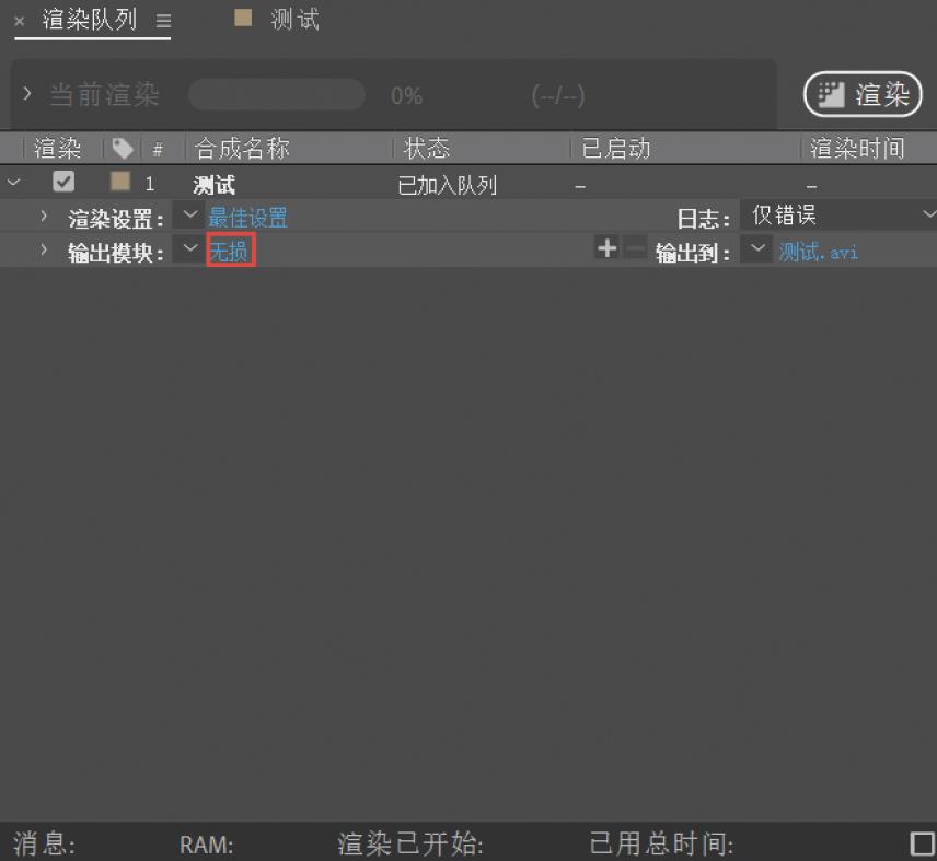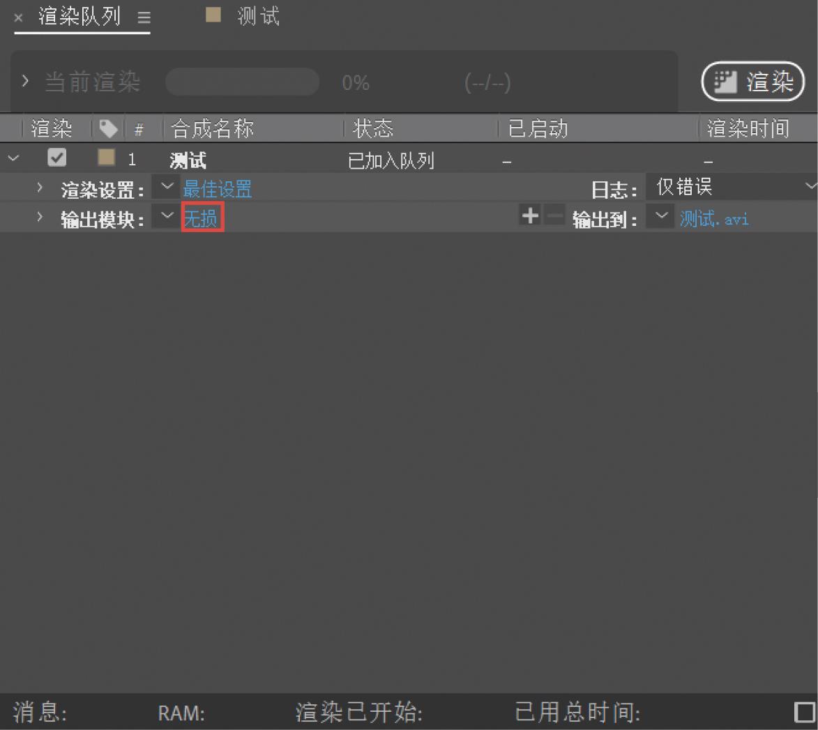 单击渲染队列中“输出模块”后的蓝色字样,如图A-12所示,可以对“输出模块”进行设置,如图A-13所示。