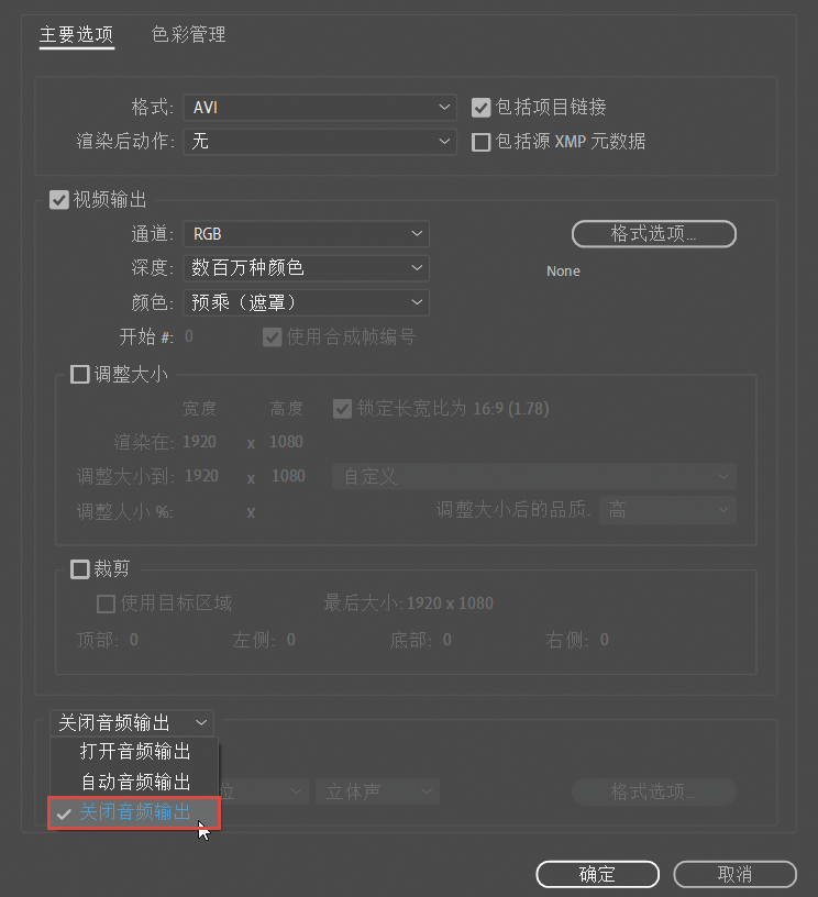 如果不希望最终输出的影片中包含音频,可以在添加合成到渲染队列后,单击“输出模块”后面的蓝色字样,如图A-20所示。在弹出的对话框中选择“关闭音频输出”,即可渲染输出没有声音的视频,如图A-21所示。