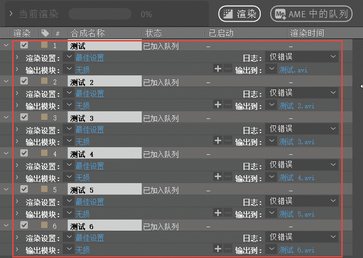 如果需要一次性渲染多个合成,则可以在“项目”面板中将想要渲染的合成选中,如图A-8所示。按快捷键Ctrl+M,将它们一次性添加到渲染队列中,如图A-9所示。设置好各项属性和输出的位置后,单击“渲染”按钮