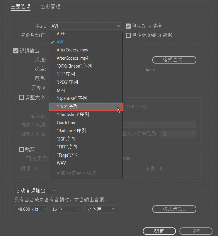 如果想以序列帧的形式渲染制作好的内容,需要单击“输出模块”后的蓝色字样,在弹出的对话框中设置“格式”为“‘PNG’序列”,如图A-22所示。如果需要输出带有透明背景的序列,就需要将“通道”修改为RGB+Alpha,如图A-23所示。