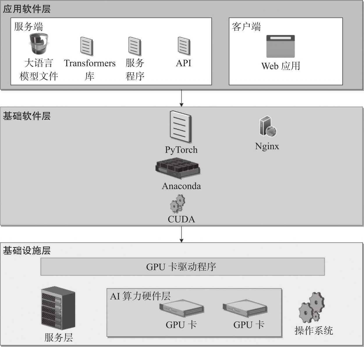 ;第三部分是应用软件,一般由服务端和客户端组成。大语言模型应用的整体架构如图2-1所示。