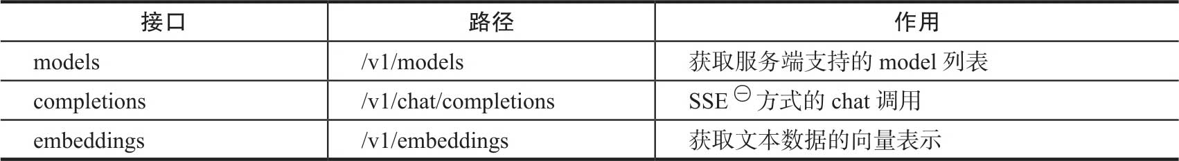 在Chat应用方面,OpenAI提供的API主要有三个,分别是models、completions和embeddings,其请求路径(path)及主要作用见表2-1。