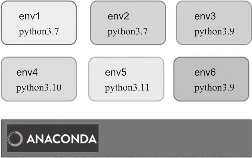 实现Python环境虚拟化,可用Python的venv模块或Python的一个发行版Anaconda。这两个软件都能达到环境隔离的目的,可任选其一。在本书中采用了Anaconda,其架构如图2-2所示。