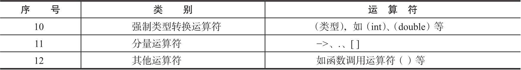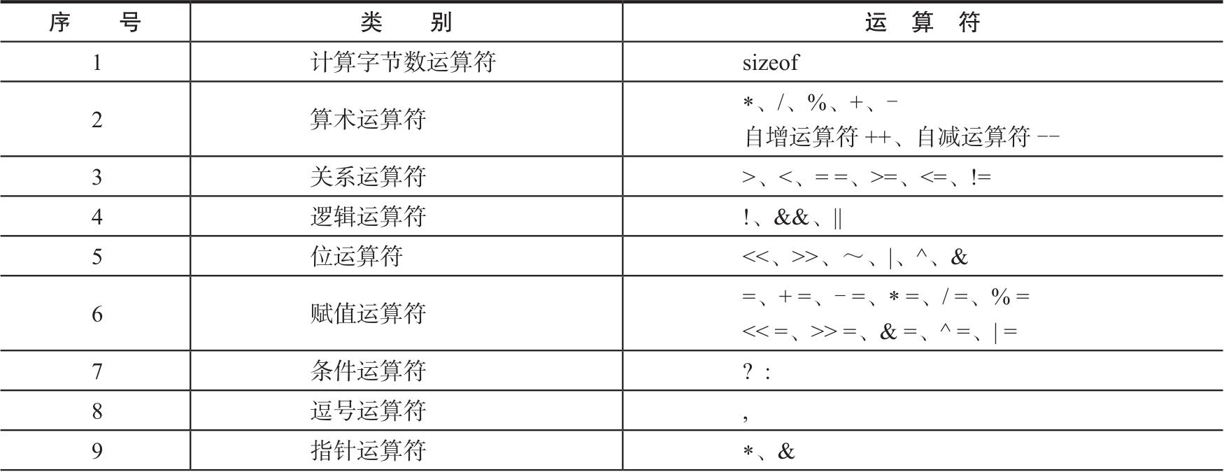 运算是对数据进行处理和操作的过程,描述各种处理和操作的符号称为 运算符 (也称为 操作符 )。C语言把除了控制语句和输入、输出以外的几乎所有的基本处理和操作都作为运算符处理,因此C语言的运算符的作用范围很宽泛。按照运算符的作用将其分类,如表2-4所示。