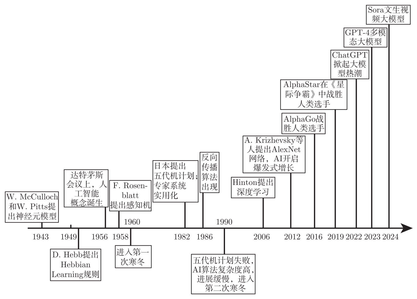 人工智能的萌芽至少可以上溯到20世纪40年代。例如,1943年W.McCulloch和W.Pitts提出了首个人工神经元模型 [7] ,1949年D.Hebb提出了赫布规则 [8] 来对神经元之间的连接强度进行更新。但人工智能概念的正式诞生则要等到1956年的达特茅斯会议 [9] 。自那以后,人工智能60多年的发展历史几起几落,经历了三次热潮,但也遇到了两次寒冬(如图1.2所示)。