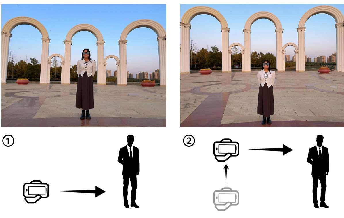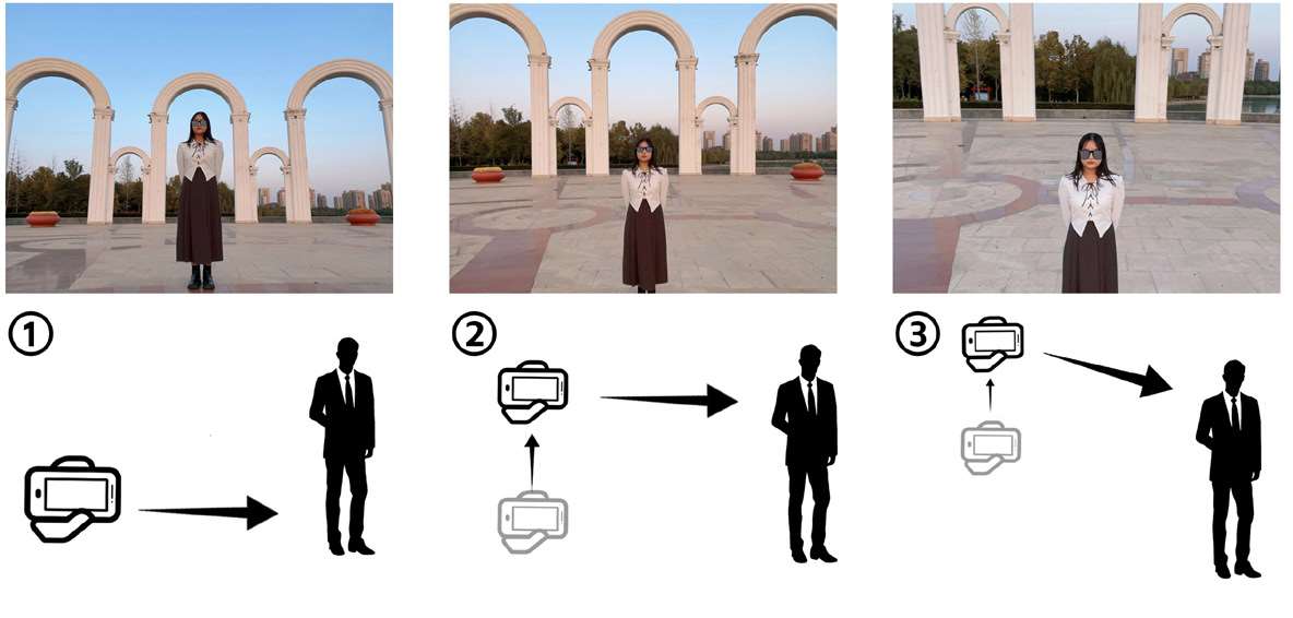 第二步,保持手机方向不动,由下向上垂直上升,完成拍摄。