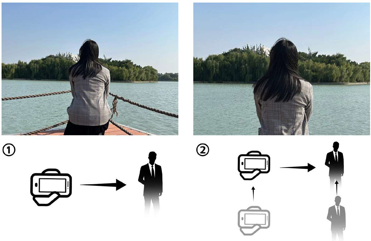 第三步,将手机微微向下内扣,形成一种俯视视角,使画面中环境占比更大,人物占比更小,完成拍摄。