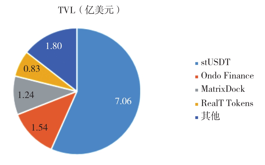 目前,RWA市场头部效应显著,市场规模位居前4位的项目分别为stUSDT(7.06亿美元)、Ondo Finance(1.54亿美元)、Matrix Dock(1.24亿美元)、RealT Tokens(0.83亿美元),累计市场份额约为86%(见图2-1)。根据RWA赛道监测平台DeFiLlama的数据,截至2024年7月31日,通证化国债市场的价值已从一年前的约4.96亿美元增长至12.84亿美元,平均年化到期收益率约为5%。