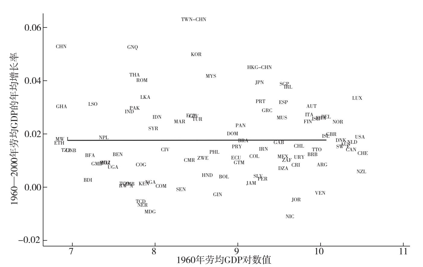 图1.13 世界各国和地区1960—2000年劳均GDP的年均增长率与1960年劳均GDP对数值