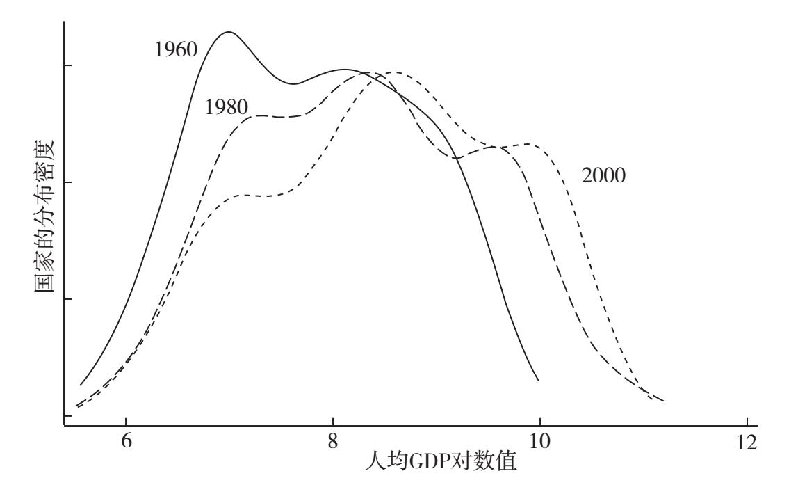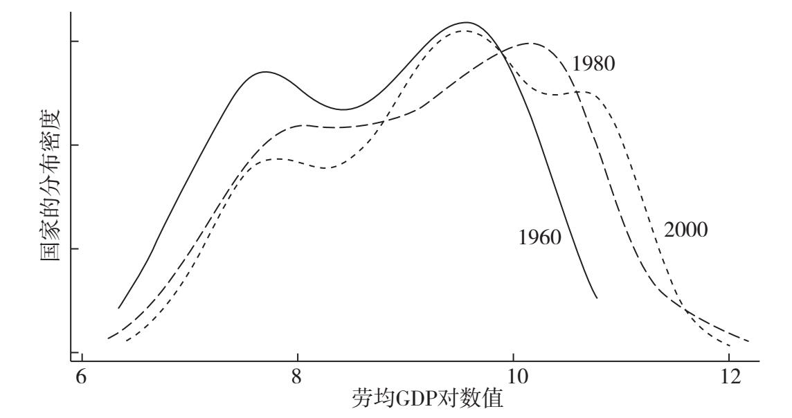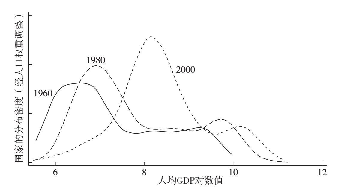图1.2给出了一个相似的图形,但这个分布更加紧凑,因为从1960年到2000年,尽管贫富国家之间的绝对收入差距增长明显,但相对收入差距的增长则小很多。尽管如此,我们还是可以看出,人均GDP的对数分布密度在2000年要比1960年更为分散。尤其是,图1.1和图1.2都表明,相对富裕国家的分布密度显著提高了,但仍有许多国家依然非常贫困。后一个图形有时候被看作一种“分层现象”,这源于20世纪60年代部分中等收入国家已经逐渐加入了高收入国家的行列,而其他一些国家则停留在中等收入阶段,甚至相对贫穷化。