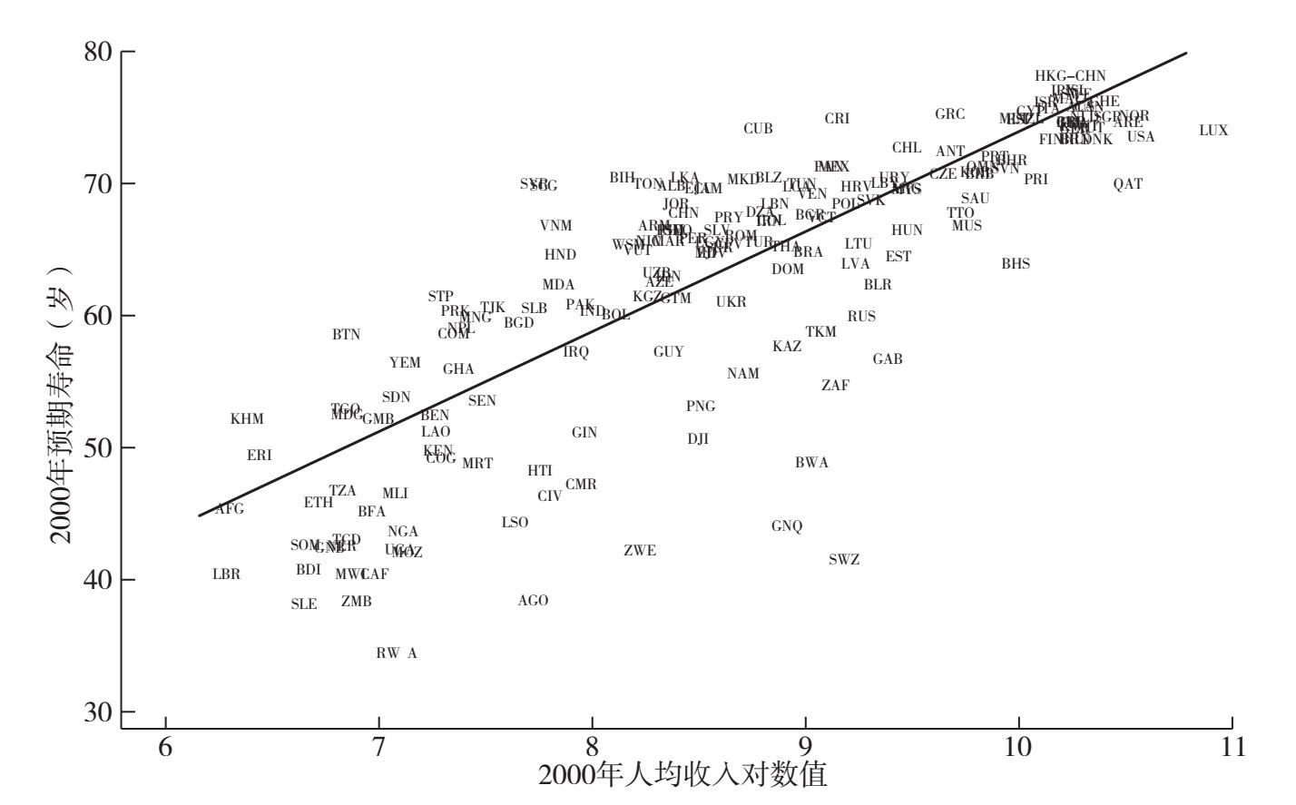 图1.6 2000年人均收入与2000年预期寿命之间的关系图