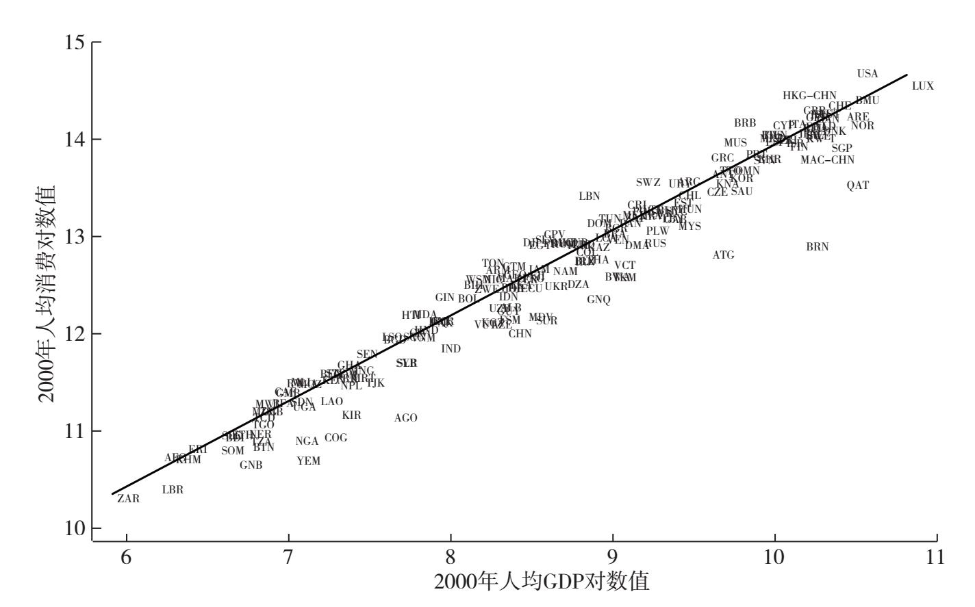 图1.5和图1.6显示了这些差距,并描述了2000年人均收入、人均消费与出生时的预期寿命之间的关系。消费数据同样来源于佩恩世界数据统计表,出生时的预期寿命数据来自世界银行发展指数。