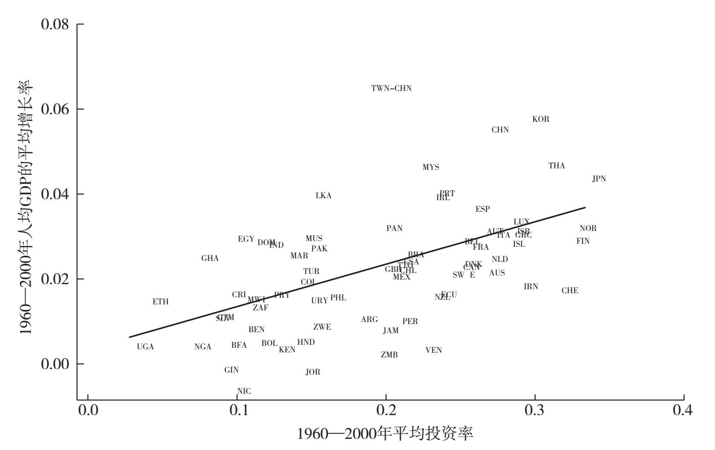 图1.15 1960—2000年各国和地区人均GDP的平均增长率与各国投资占GDP比重的平均增长率之间的关系
