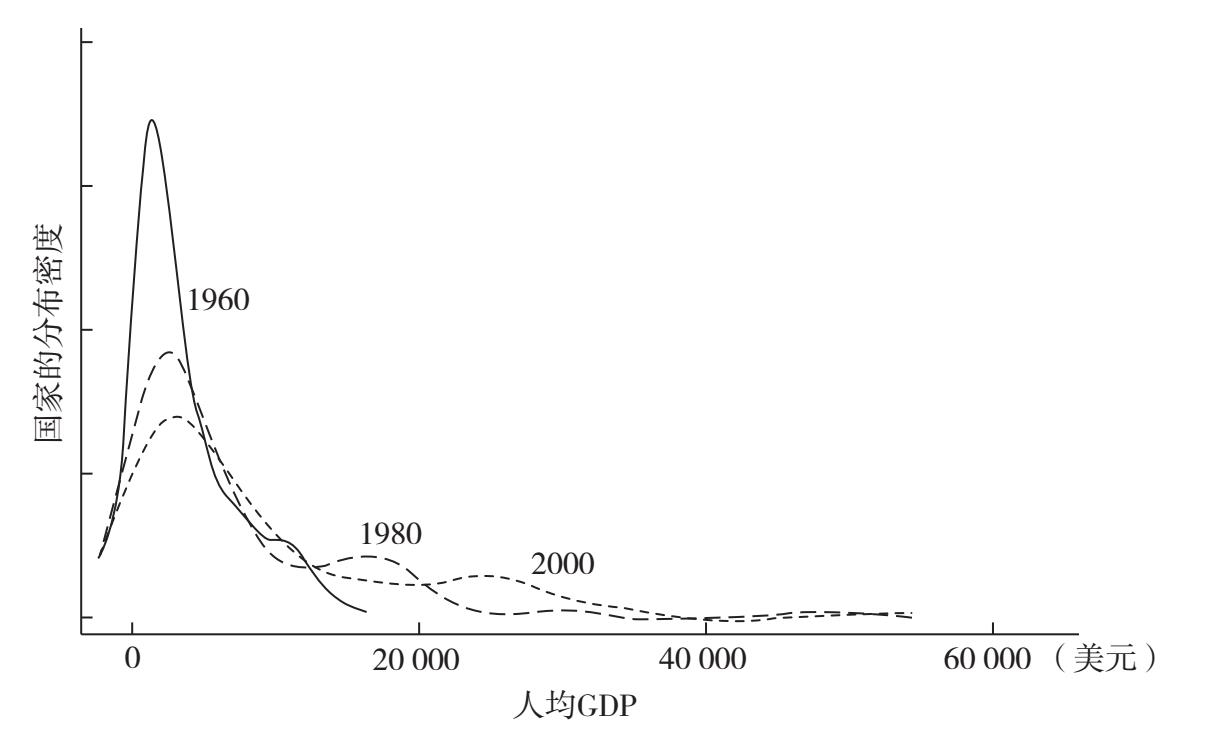 是1 250美元。1980年和2000年的分布右移,表明在随后40年里人均收入的增长。到2000年,众数值超过3 000美元,而且一些国家的人均收入集中于20 000至30 000美元之间。2000年的分布密度估计值显示各国人均收入存在着显著的不平等。